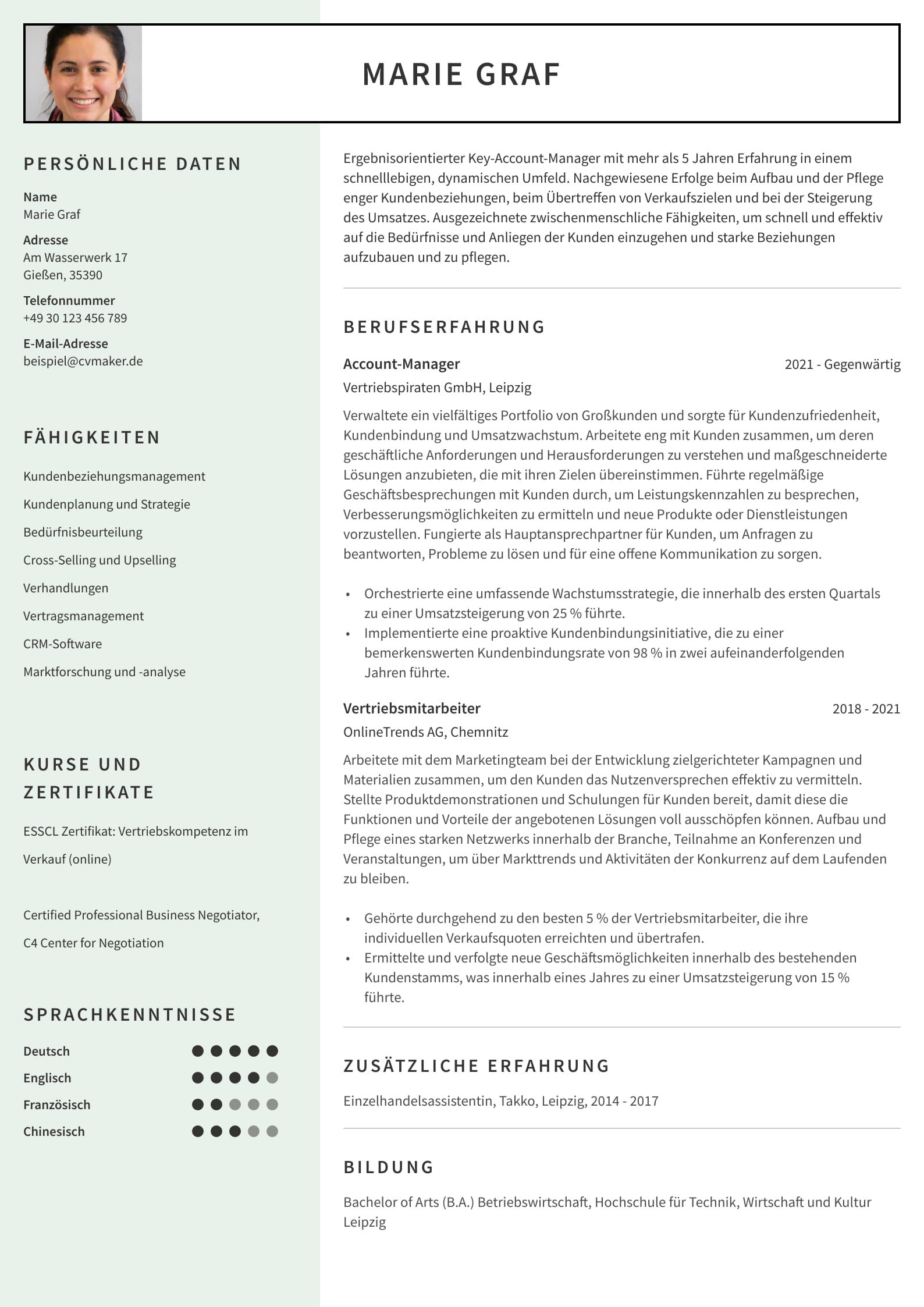 Als Key-Account-Manager besitzt Marie eine große Verantwortung. Um ihre berufliche Laufbahn in Schwung zu bringen, wählte sie die Auckland-Lebenslaufvorlage, die ein stimmiges Gesamtbild vermittelt.