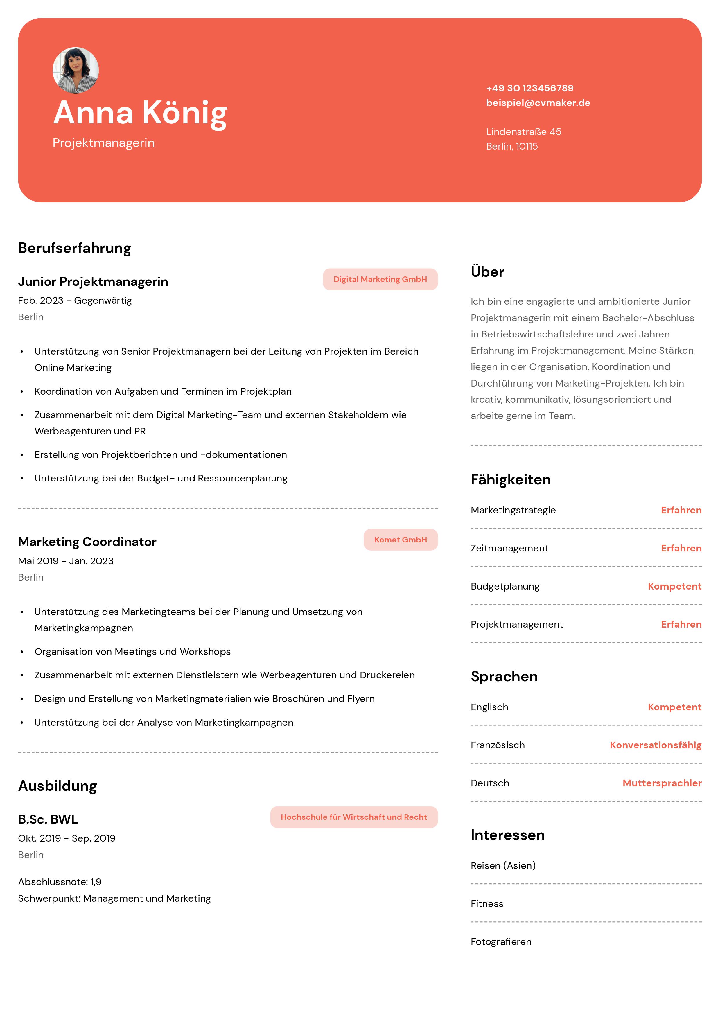 Anna aus Berlin hat sich für eine übersichtliche Lebenslauf-Vorlage für Projektmanager und Projektmanagerinnen auf CVMaker entschieden. Dieses Lebenslauf-Beispiel für Projektmanager*innen zeigt ihre Qualifikationen und Kompetenzen in einem übersichtlichen, zweispaltigen Layout.